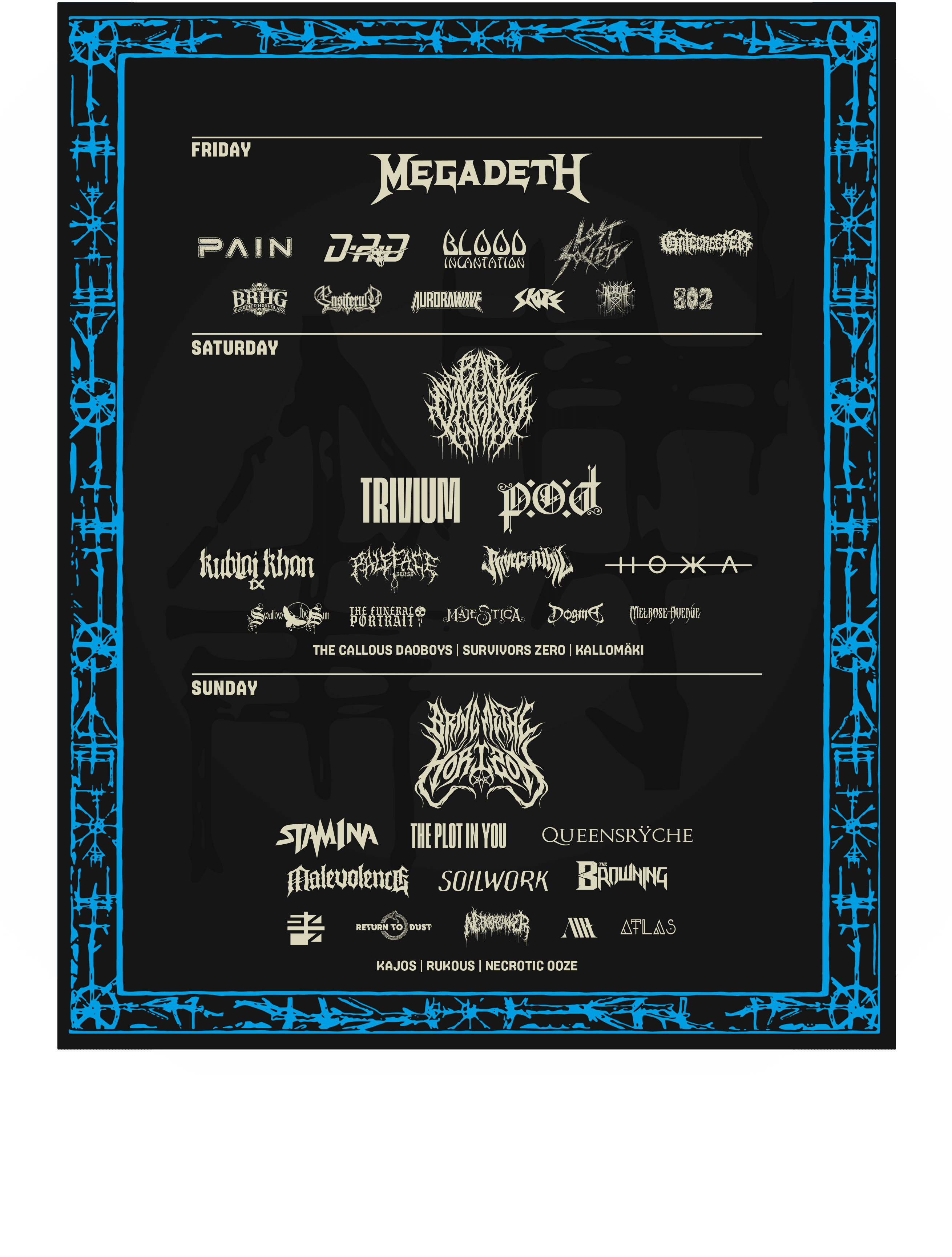 Pain, D-A-D, HOKKA, Gatecreeper, aurorawave, The Funeral Portrait, Swallow The Sun, Sara, Survivors Zero, Kallomäki, Kajos, Rukous ja Necrotic Ooze