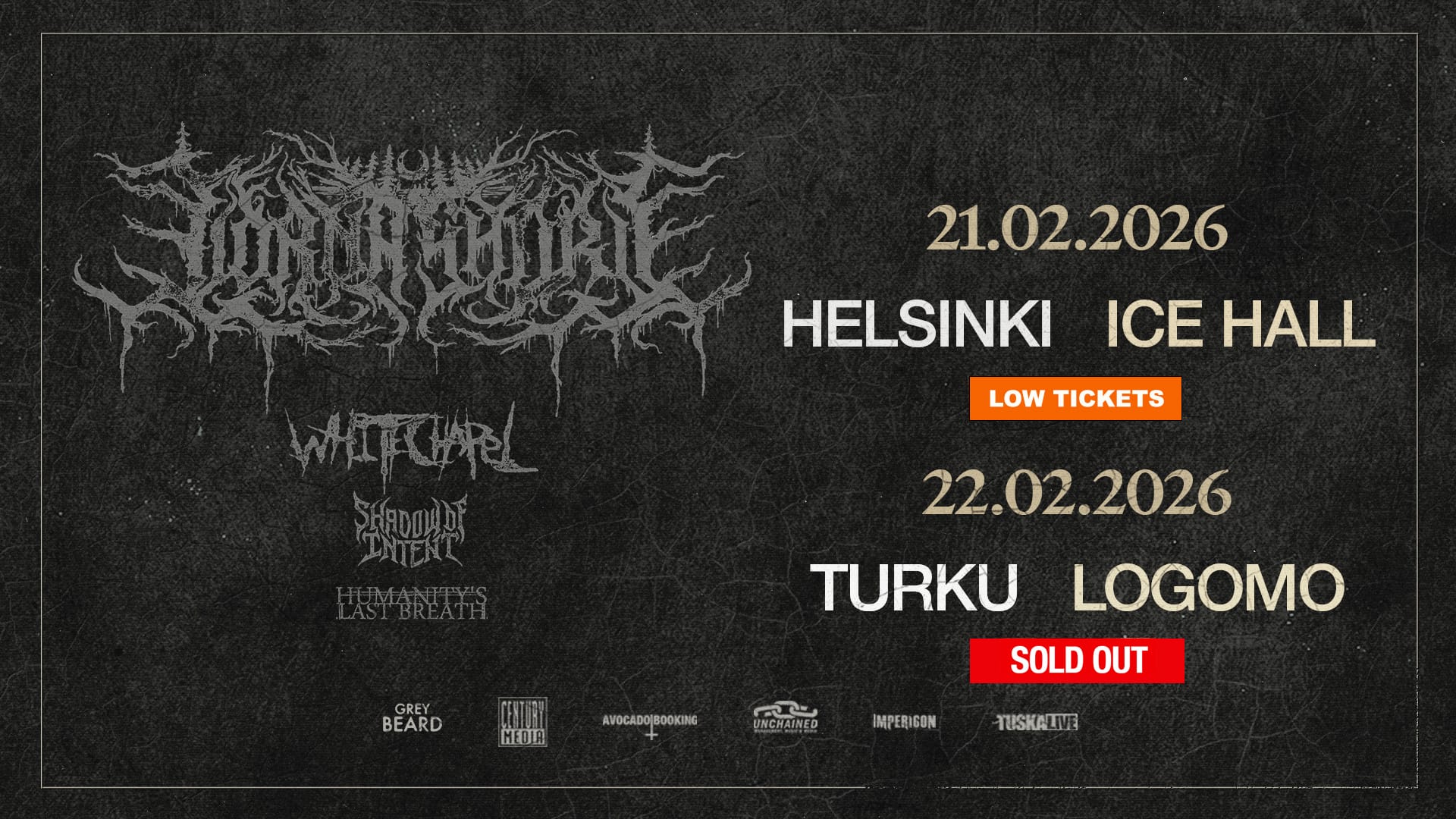 Lorna Shoren mukana molemmilla keikoilla nähdään kolme äärimetallin kovinta ja teknisintä nimeä: Whitechapel, Shadow of Intent ja Humanity’s Last Breath. Tämä kokoonpano takaa illan, joka on täynnä armotonta intensiteettiä, synkkää tunnelmaa ja huipputason musiikillista taituruutta.